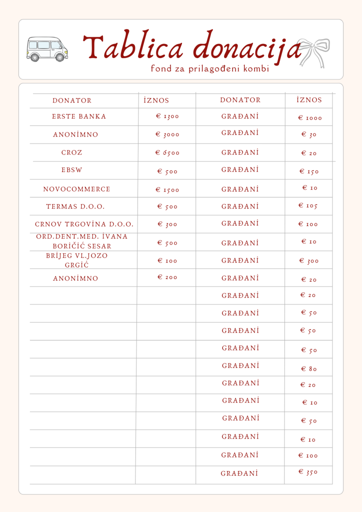 Sva prikupljena sredstva biti će u cijelosti usmjerena na realizaciju projekta kupnje prilagođenog kombija, donacije će biti vidljive u tablici koja će se redovito ažurirati.